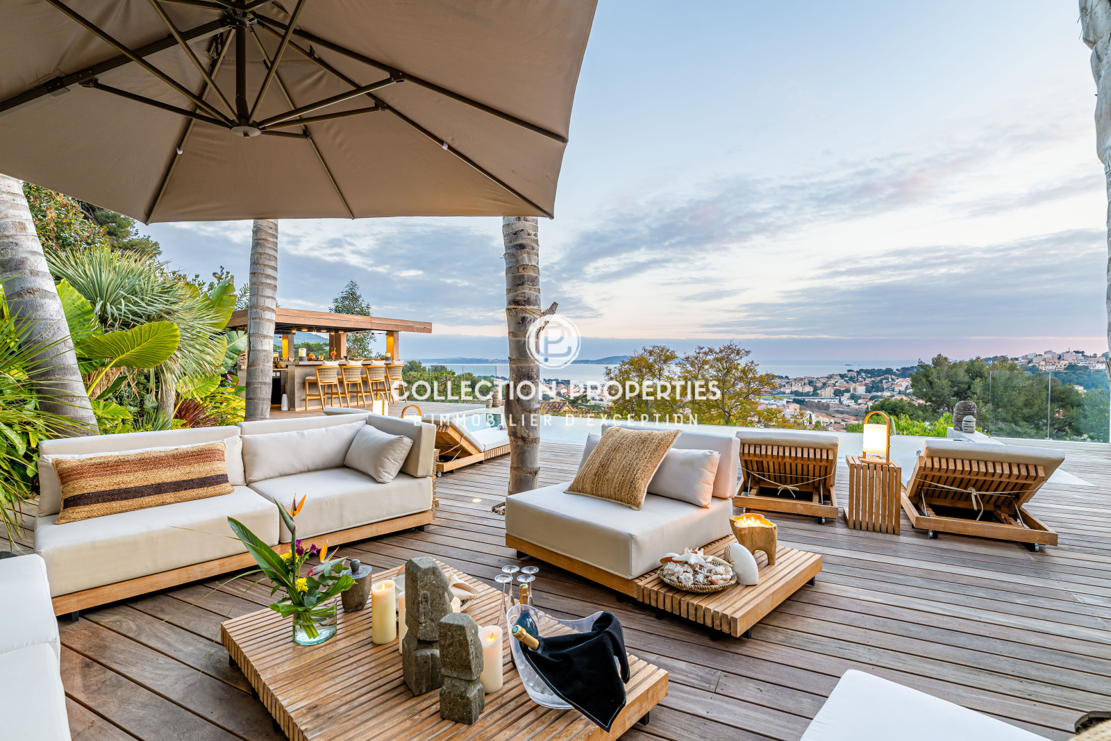 Carqueiranne (83320)Carqueiranne: Vendue en 1 visite par Collection-Properties: Joyau de l'architecture contemporaine, cette superbe villa de 260m2 habitable sur 1500m2 de terrain offre des prestations et des finitions uniques et une splendide vue sur la mer et la baie de l'Almanarre et la presqu'île de Giens. Magnifique pièce de vie de 90m2 s'ouvrant sur la terrasse en bois vue mer ainsi que l'espace piscine avec son son bar-cuisine d'été très élégant. Sur ce même niveau, une vaste suite parentale avec dressing-salle de bain (avec une douche extérieure) et son espace bureau. Au niveau inférieur, vous trouverez 4 chambres et 3 salles d'eau. Au total, plus de 300m2 de terrasse orientés vers la mer. Piscine chauffée, barbecue, garage double. Villa vendue meublée. Pour d'autres biens similaires contactez le 04-22-54-24-76.